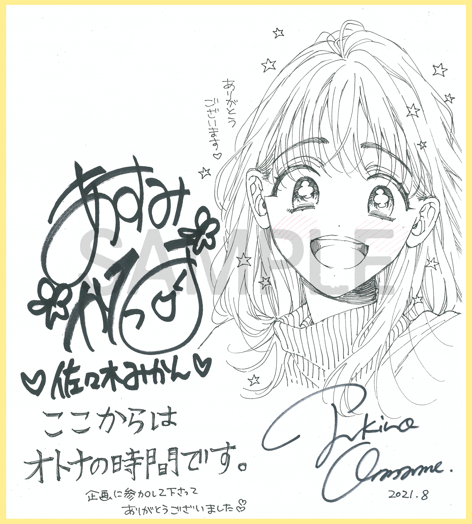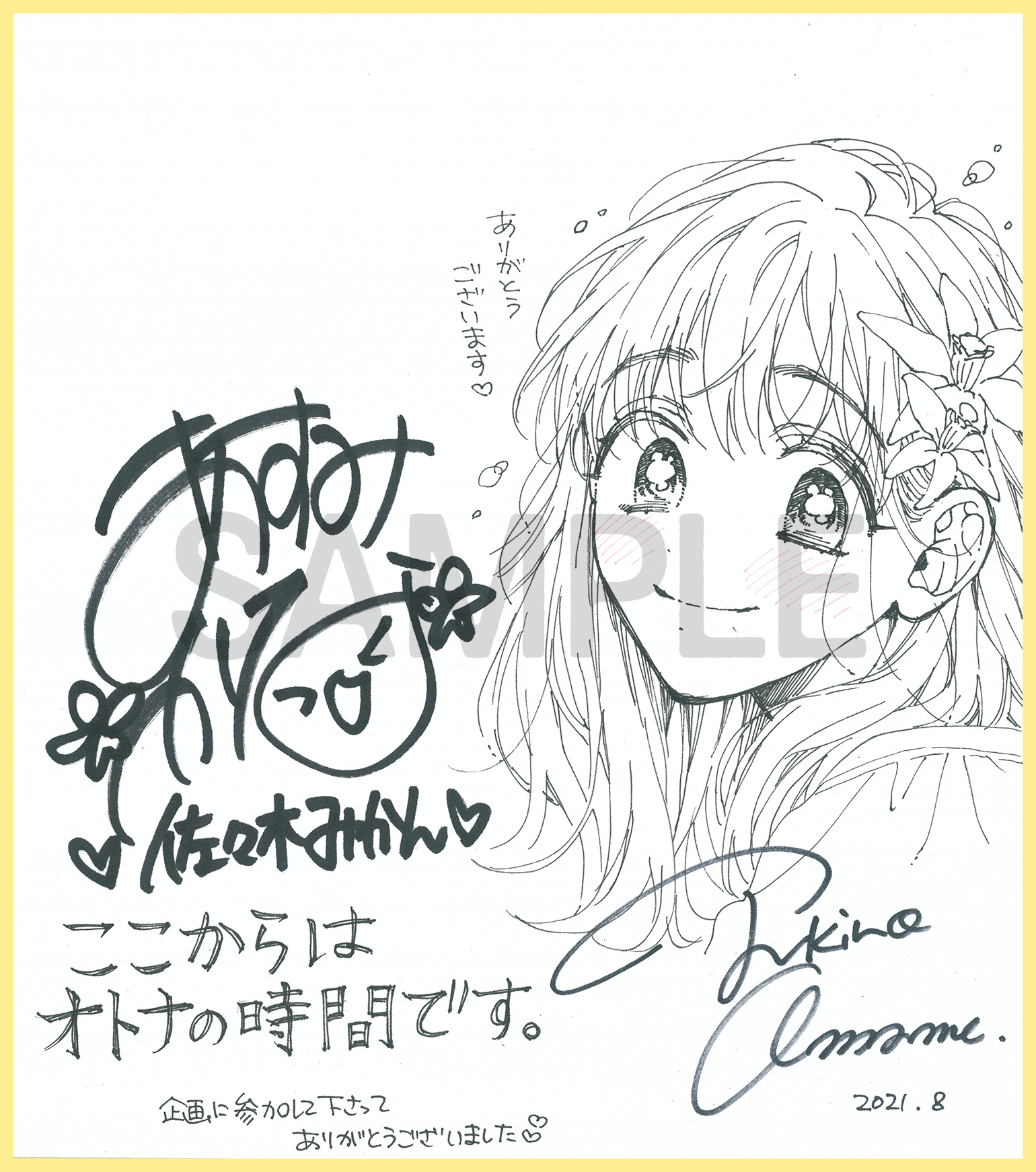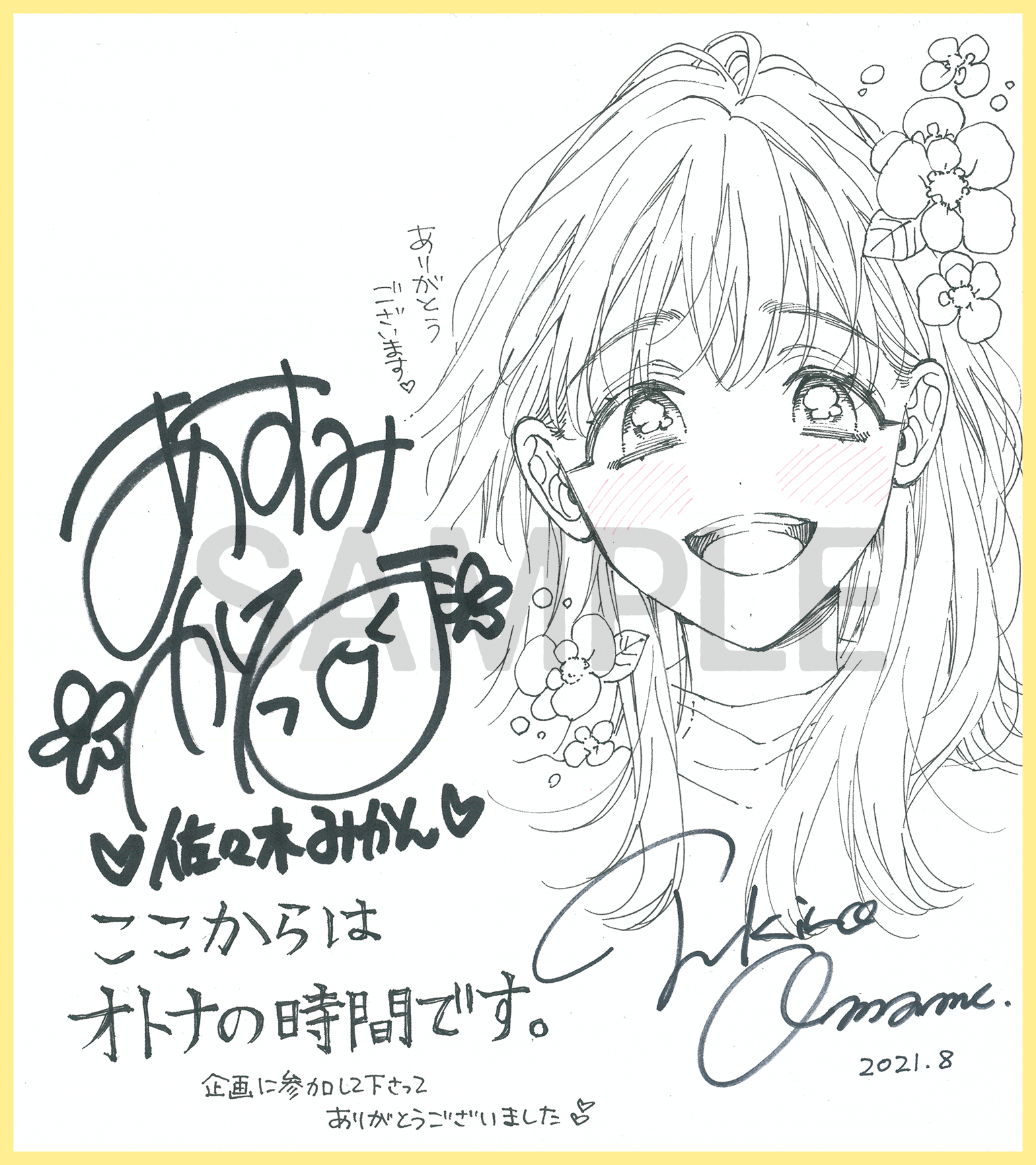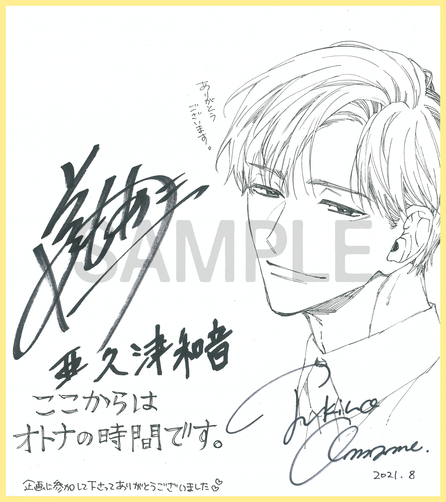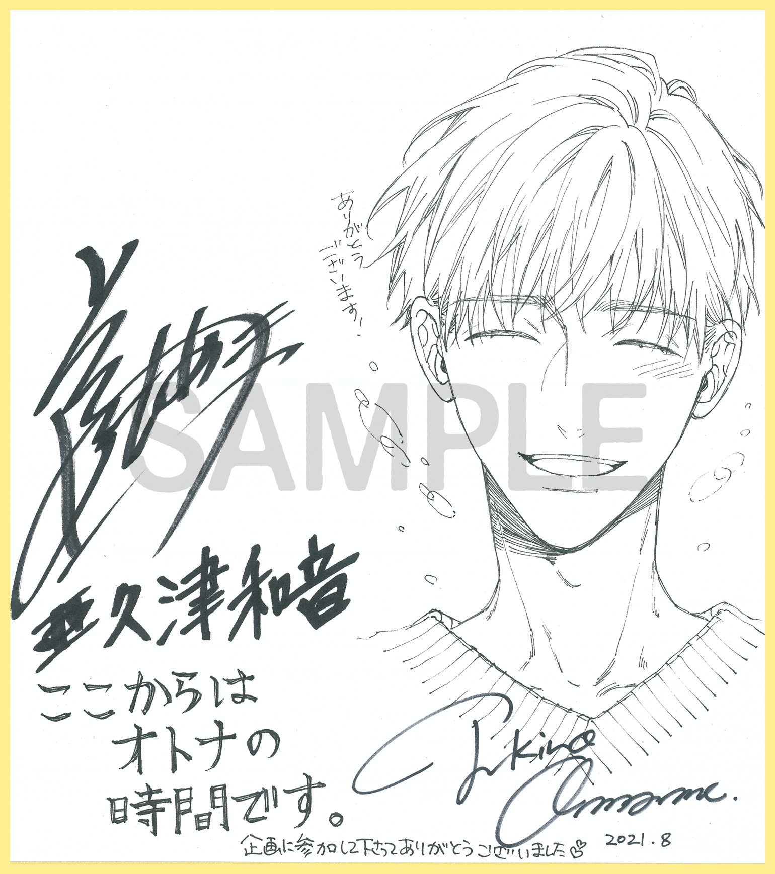 ・応募期間外のご応募は無効となります。 ・サイン色紙には当選者様のお宛名を入れさせていただきます。 ・当選者様にはDMにて、発送先のご住所・お名前・お電話番号・サイン色紙に記載するお宛名をお伺いします。 ・抽選期間中(2021年9月1日~2021年9月7日)にDMをお送りできる設定になっていない方、何らかの理由で弊社よりDMのお送りができない場合、当選が無効になってしまう恐れがございます。 ・個人情報は本企画進行以外の目的に利用することはありません